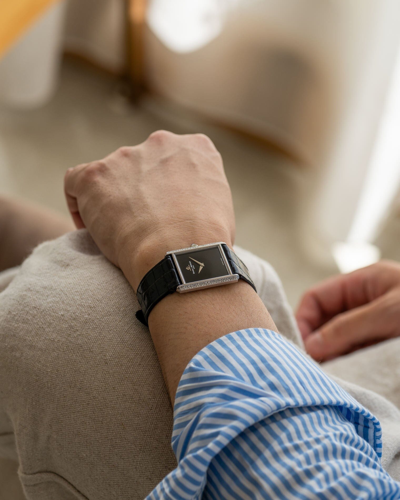 The case material is 18K white gold. A rectangle case reminiscent of a Cartier tank. The crown is set with a cabochon-cut blue sapphire.