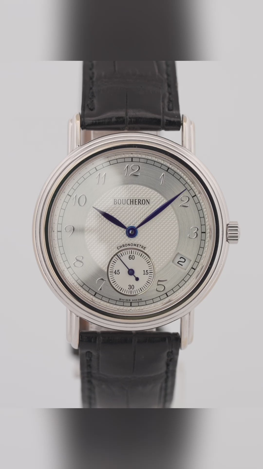 The case is a round case made of 18k white gold. The classical straight lugs and step bezel are eye-catching.