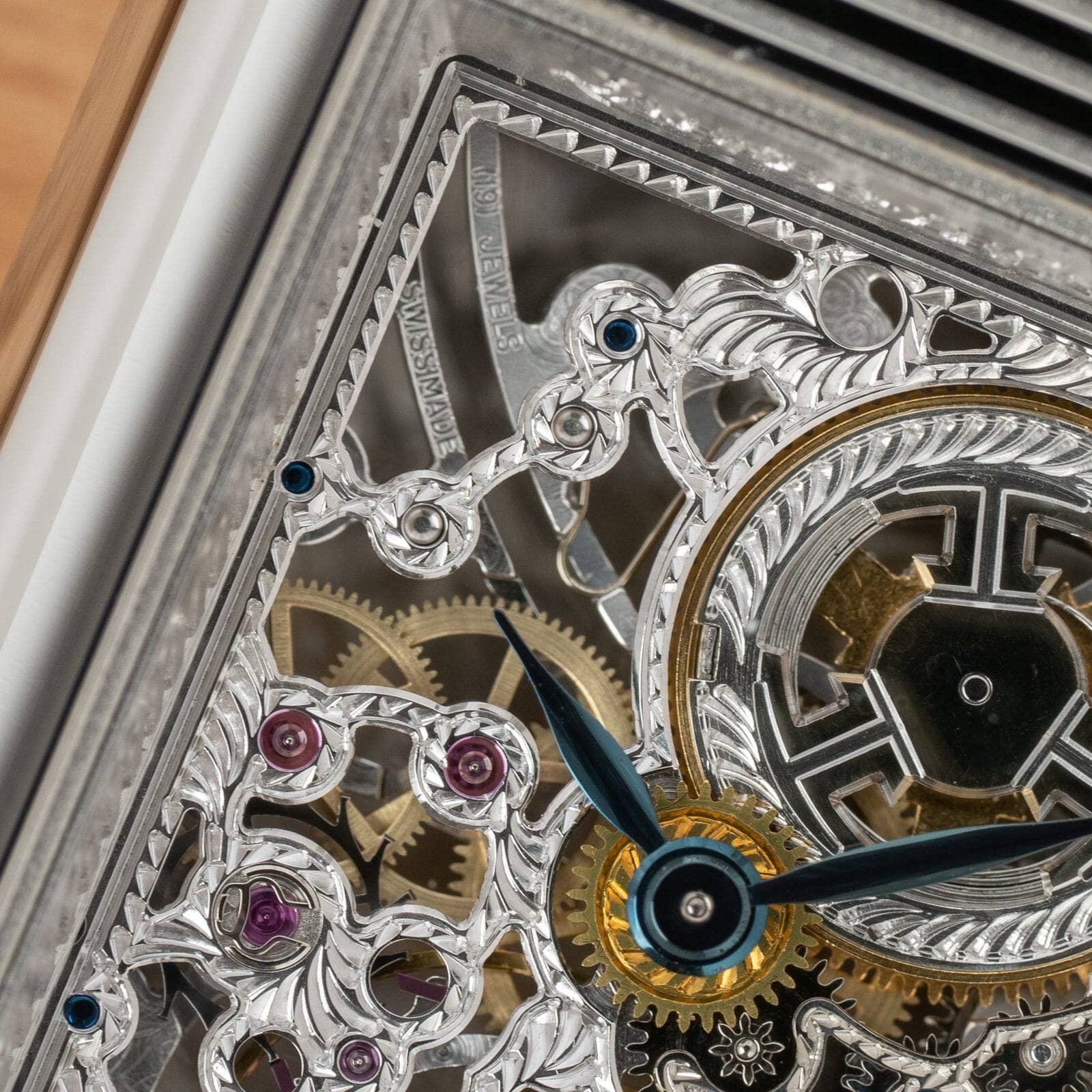 The skeletonised design on both the front and back of the watch is a key feature, allowing the beautiful finishing of the movement to be seen.