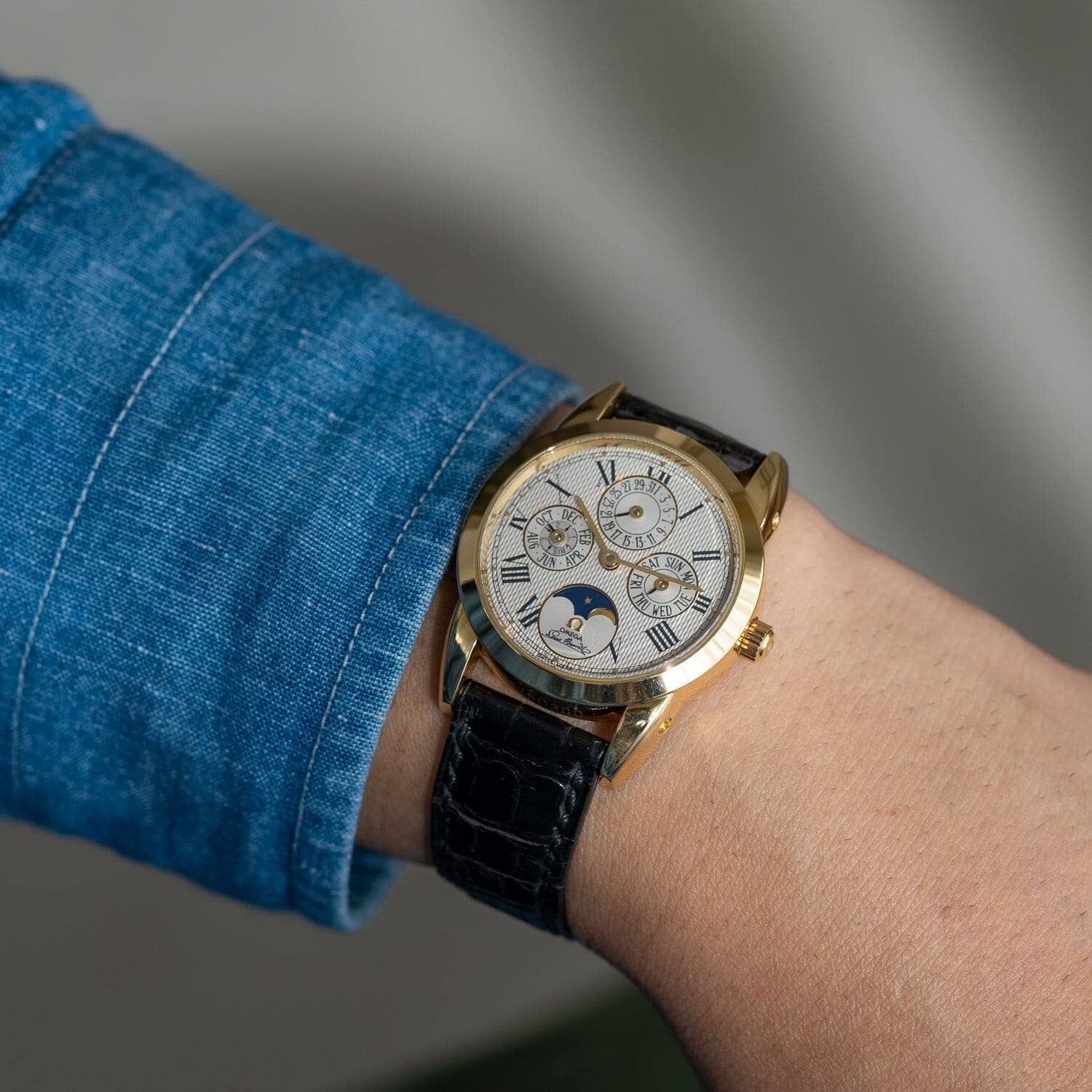 It's a classic watch with a small 34 mm YG case and a perpetual calendar.