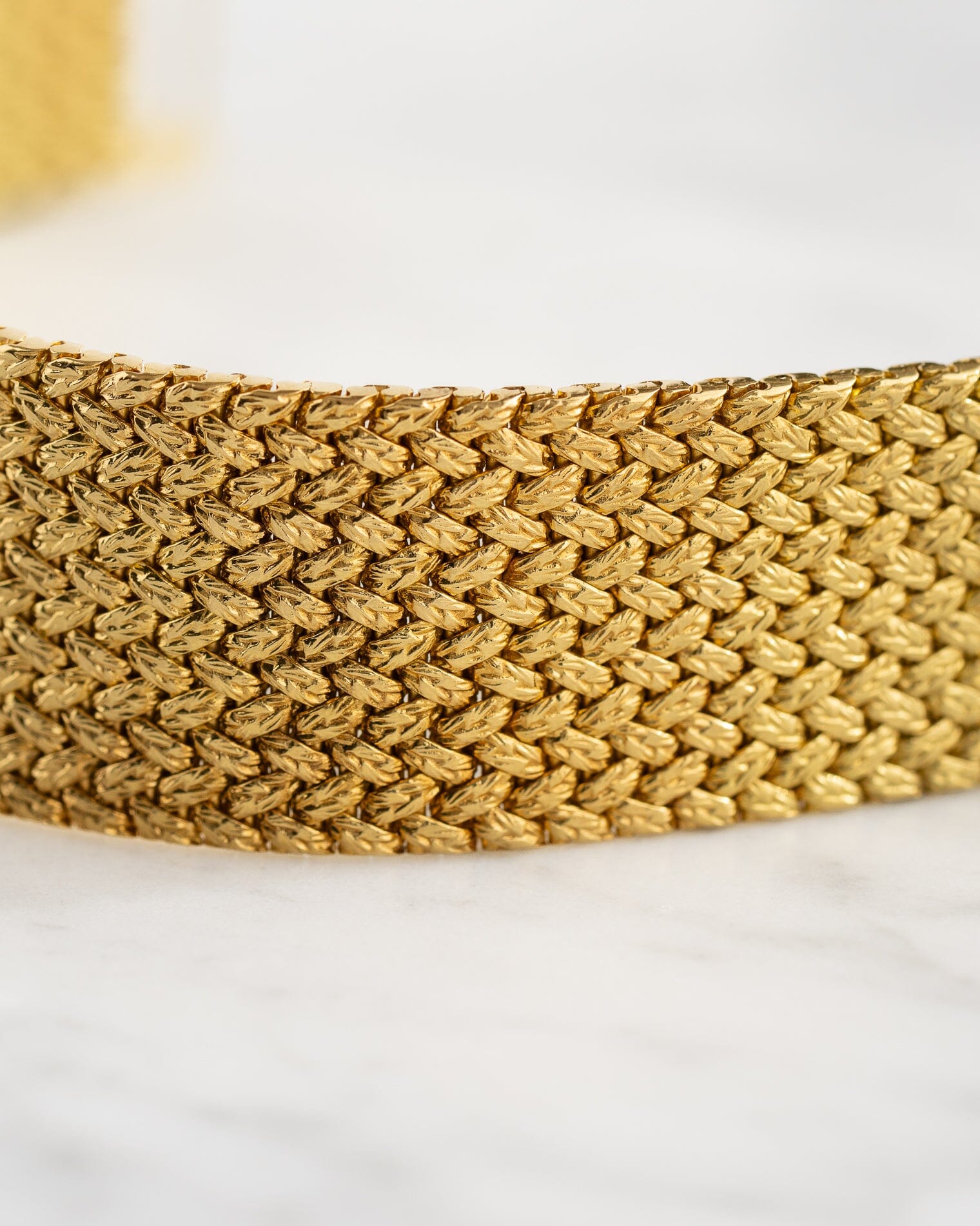 Both the case and bracelet are made of 18k yellow gold, with highly intricate decoration on the front. It can be said that it is a watch with a geometric pattern that is difficult to describe, and contains many jewelry-like elements.