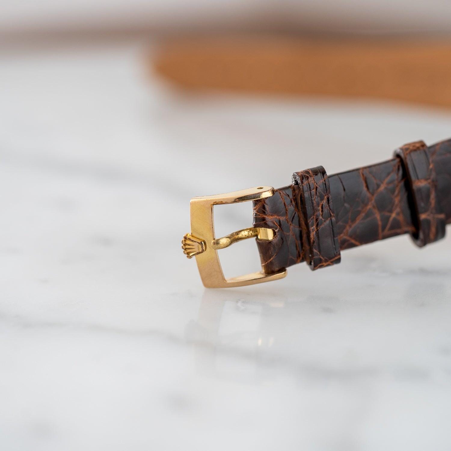 Comes with a light dark brown leather strap using Kaiman crocodile. The buckle is a genuine Rolex GP buckle.