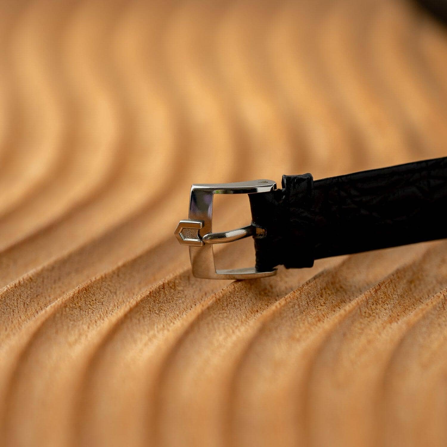 Comes with a genuine leather strap and a genuine buckle with the Universal logo.
