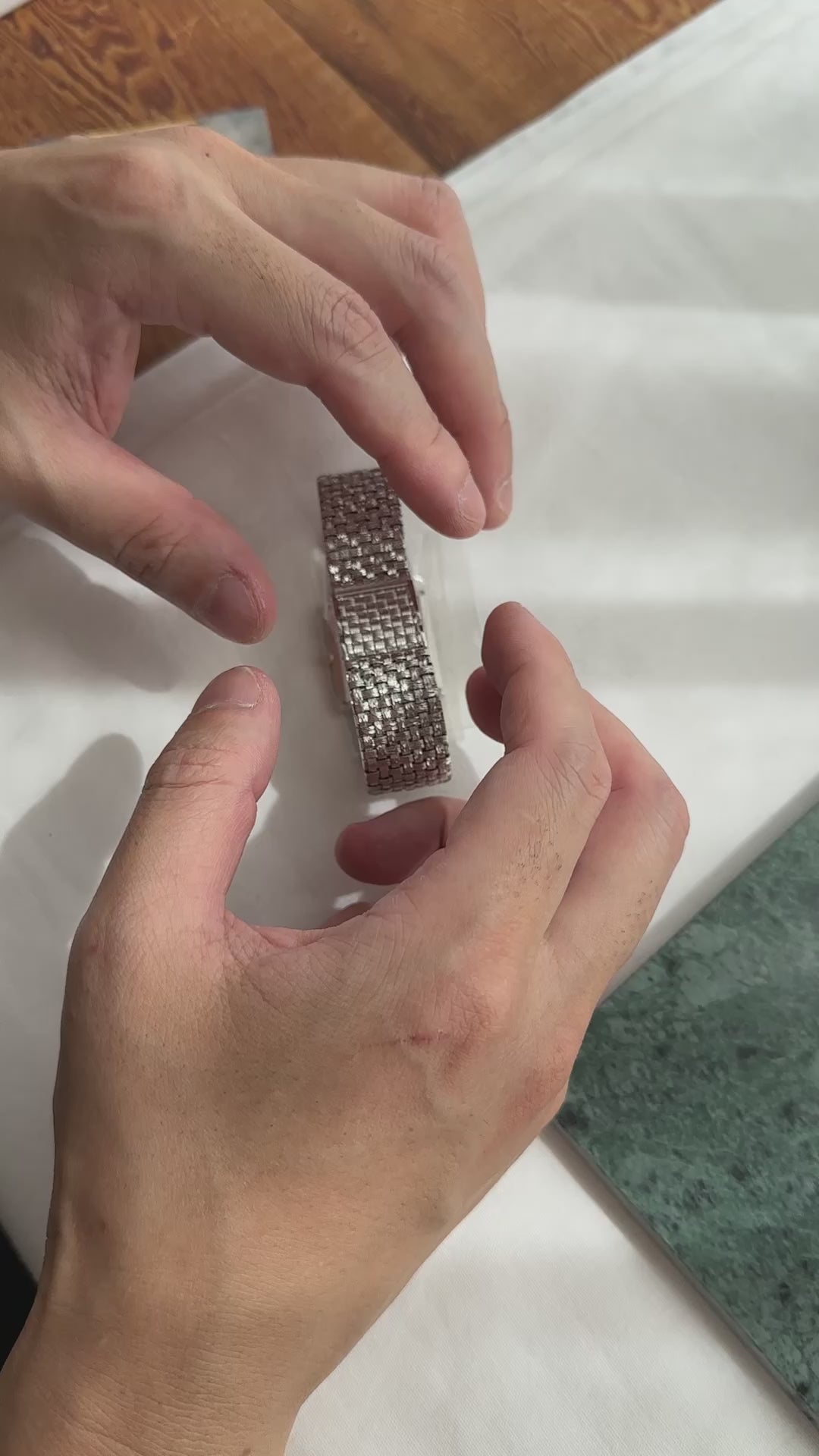 The bracelet is also made of 18K white gold and is integrated with the case. Unlike the case, the bracelet has a braided structure with a bark finish.